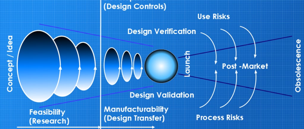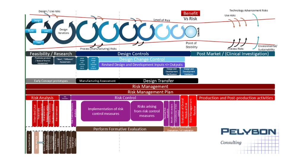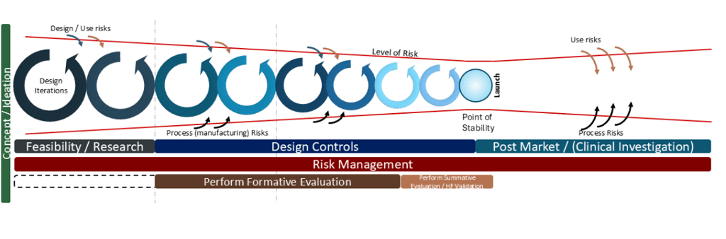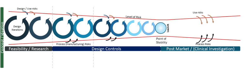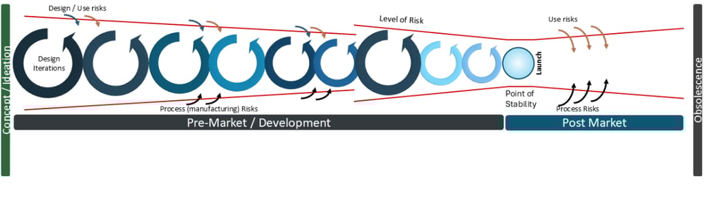 When I first mapped this diagram in 2016, the focus was on the latent level of risk relative to the Design Control process. The reduction in level of risk aligned with a principle of Design ‘funnelling’ which I first learned of from consultancy PDD Group LTD and their presentation “Insight, Innovation & Design” back in 2007. Over the time of development, the size of design change iteration should reduce, ie in early phase prototyping the amount of changes should be significantly more than minor refinements occurring at the end of the development. Put another way, it’s a failure in development if in the period prior to a planned launch, there’s a sudden requirement for a major design change (potentially caused by manufacturing feedback or potential failures in Design Verification or Design Validation testing). Ie a large design iteration loop raises the latent level of risk again.