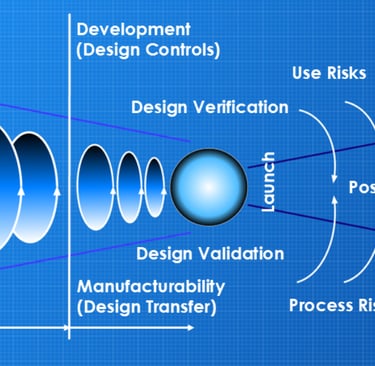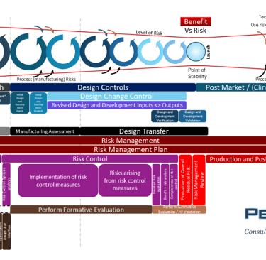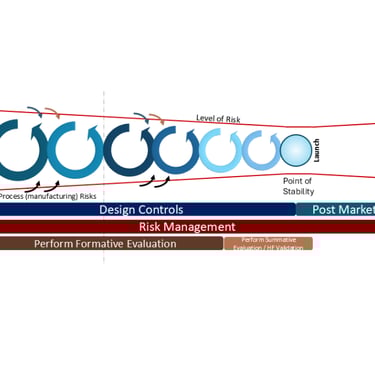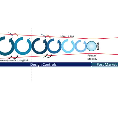 Back in 2016, I put together a diagram that would explain the latent level of risk in medical device development*, mapping it relative to the requirements of the quality process called ‘Design Controls’. I’ve used this diagram in numerous presentations at forums and conferences, whilst encouraging my teams to apply this methodology with successful results. In 2024, I updated the diagram to align with the latest regulatory and International Standards requirements by adding more detail; however, the principle remained the same - to show the management of the latent level of risk.